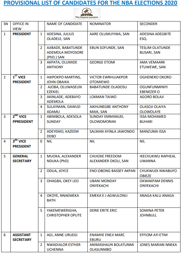 FURTHER to the call for Nomination of Candidates for election into the National Offices of the Nigerian Bar Association in the 2020 National elections, the Electoral Committee received Nominations from forty-three (43) Aspirants for various offices. At the close of the screening of nominations by a sub-committee of Electoral officers of the ECNBA in accordance with the provisions of the Constitution of the Nigerian Bar Association 2015 (as amended) and the Guidelines for the elections made pursuant thereto, twenty-four (24) Aspirants were granted provisional clearance to contest the elections, while nineteen (19) Aspirants were disqualified for various reasons.