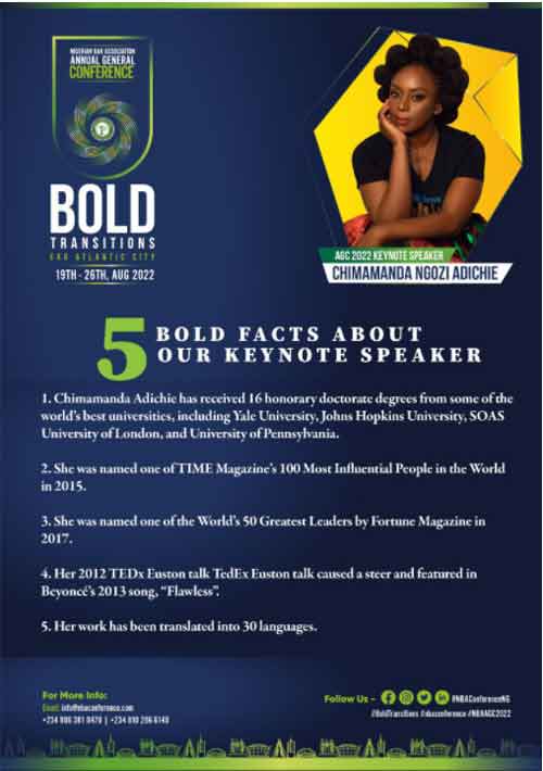 The choice of Ms Adichie also fits into the aspiration of the NBA President to make the 2022 AGC a legacy conference that sets a standard that will become a benchmark for subsequent conferences of the NBA.