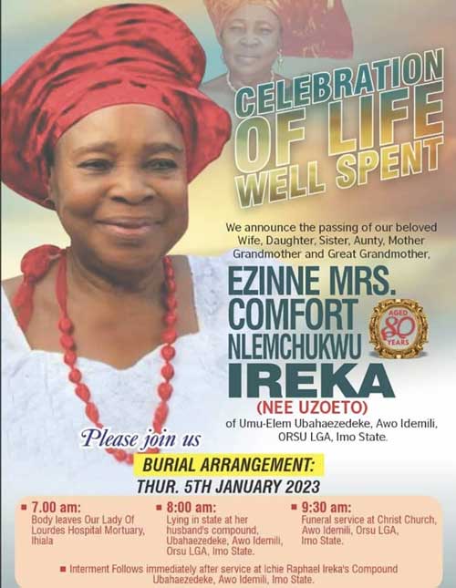 Popularly known as ‘Ezinne,’ Madam Ireka, who passed onto glory on March 27, 2022 at the age of 80, will commence her final journey home on Thursday, January 5, 2023 at 7.00 am, when her body leaves Our Lady of Lourdes Hospital Mortuary at Ihiala, Anambra State.