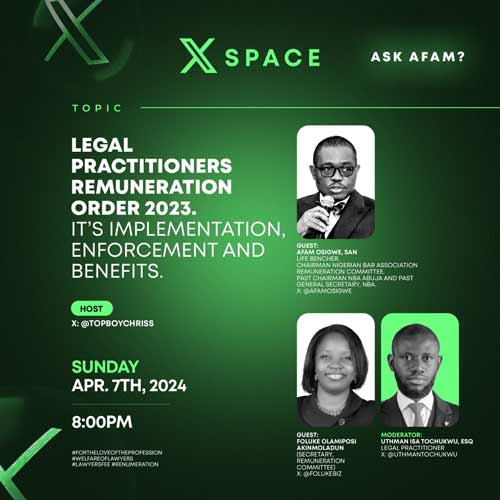 A group of legal professionals has announced an upcoming X Space discussion on the Legal Practitioners Remuneration Order 2023, scheduled for Sunday, April 7th, 2024, at 8:00 PM. The discussion will focus on the implementation, enforcement, and benefits of the new remuneration order.