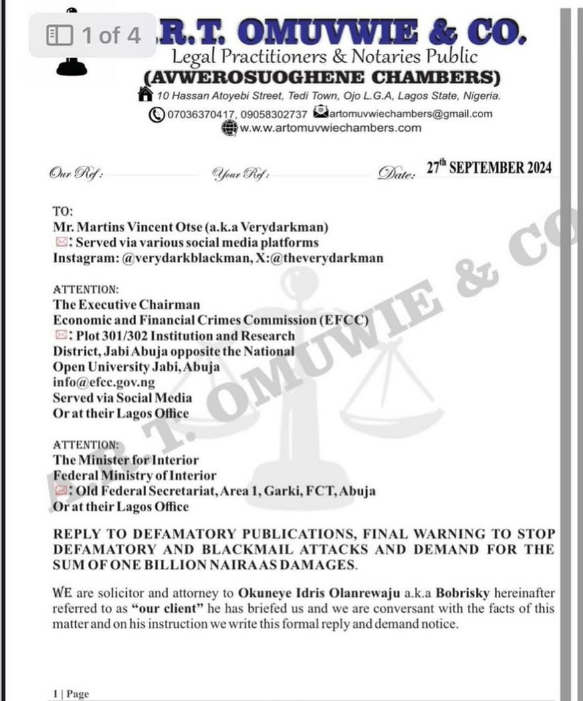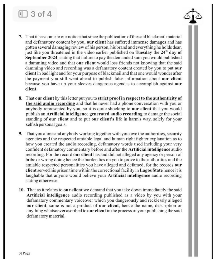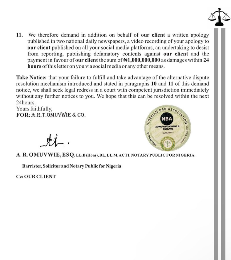 “We, therefore, demand, on behalf of our client, a written apology published in two national daily newspapers, a video recording of your apology to our client shared on all your social media platforms, a commitment to refrain from reporting or publishing defamatory content against our client, and the payment of ₦1,000,000,000 in damages within 24 hours of this letter via social media or any other means.”