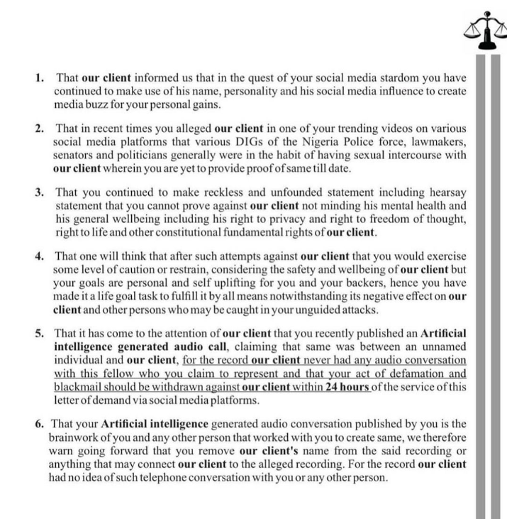 “Recently, you alleged in one of your trending videos on various social media platforms that various Deputy Inspectors General of the Nigeria Police Force, lawmakers, senators, and politicians generally were in the habit of having sexual intercourse with our client, yet you have not provided any proof of these claims to date.”