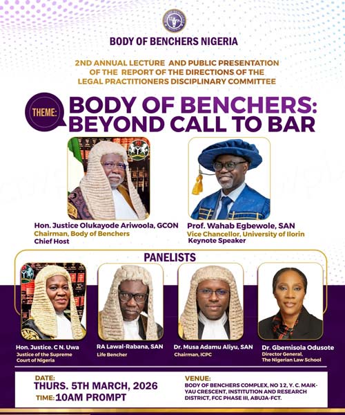 The Body of Benchers Nigeria will hold its 2nd Annual Lecture and Public Presentation of the Report of the Directions of the Legal Practitioners Disciplinary Committee (LPDC) on Thursday, March 5, 2026, in Abuja.