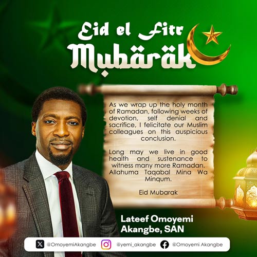 May Allah bless us with good health, abundant sustenance, and the privilege to witness many more Ramadans in peace, prosperity, and harmony. Allahuma Taqabal Mina Wa Minkum. Eid Mubarak to you and your loved ones,” said Lateef Omoyemi Akangbe, SAN.