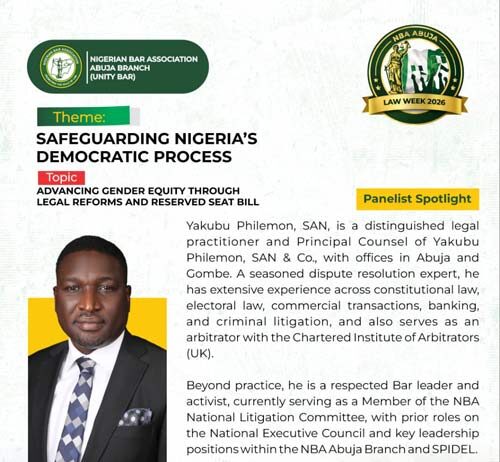 “Advancing Gender Equity Through Legal Reforms” — Yakubu Philemon, SAN To Speak At NBA Abuja Branch Law Week 2026