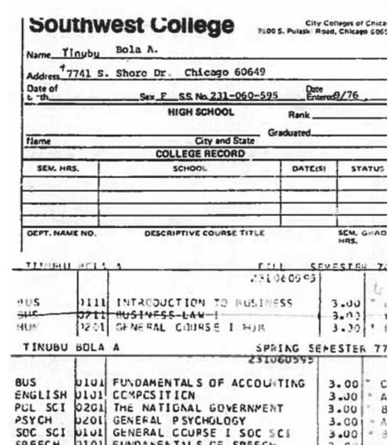 A copy of his Southwest College transcript with which he gained admission into CSU identified him as female, but CSU has attributed this to a clerical error. However, there were errors on the date and social security number. Also, the space for birthday was left blank in the Southwest College transcript Tinubu submitted to CSU.
