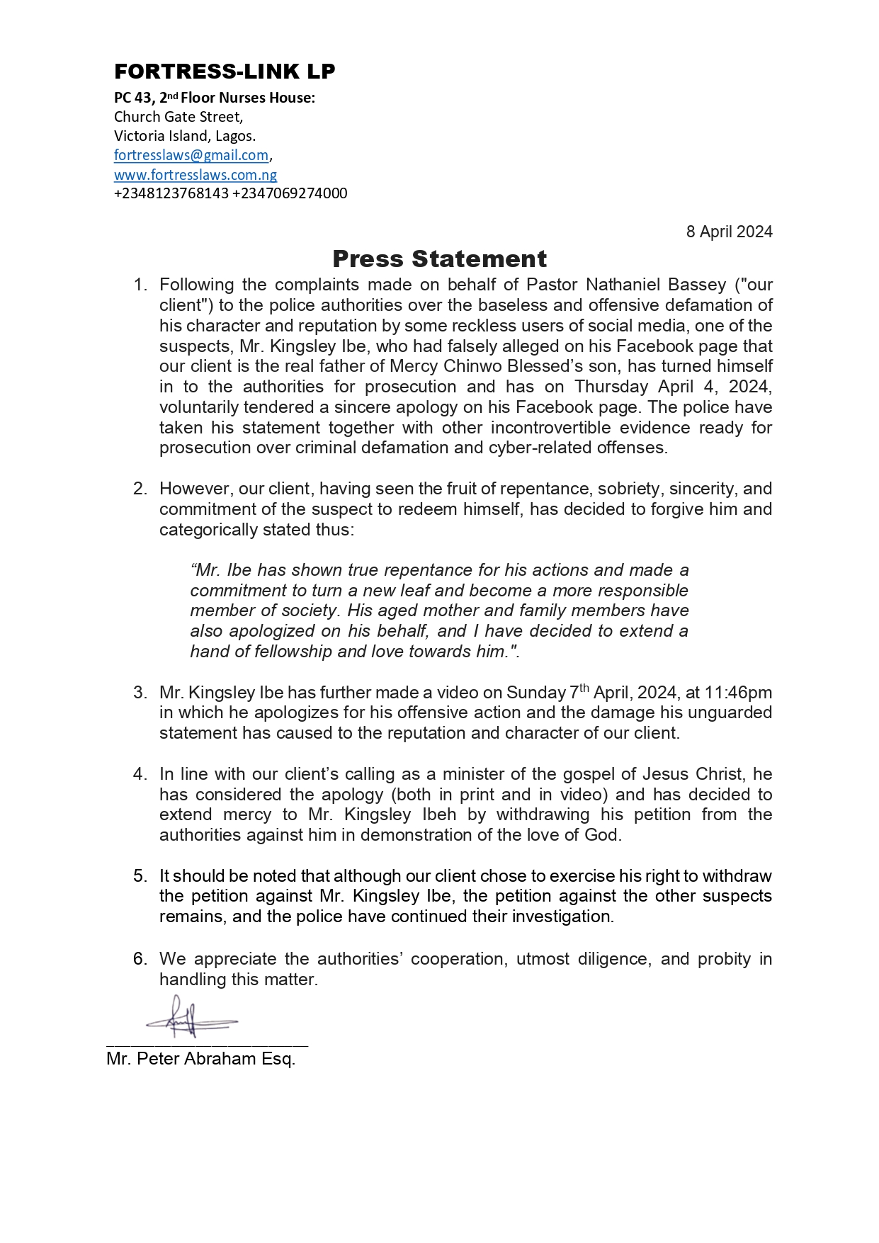 A press statement released by Bassey’s legal representatives on Monday disclosed that ”The police have taken his statement together with other incontrovertible evidence ready for prosecution over criminal defamation and cyber-related offences.”