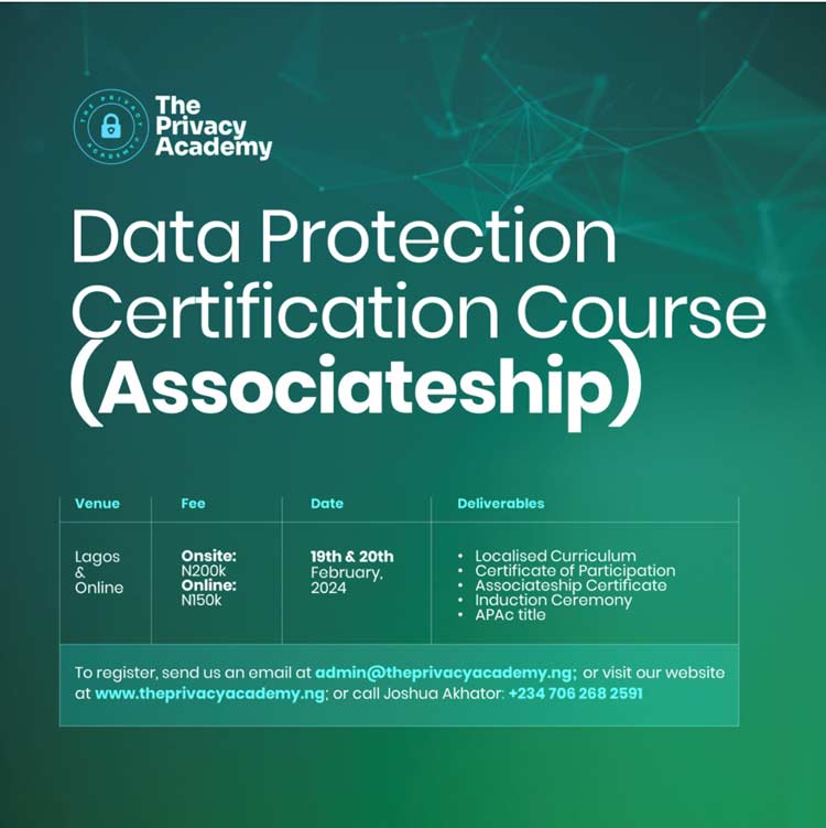 The hybrid training will be simultaneously held in Lagos and online between 19th and 21st day of February. Interested individuals can register for the courses by sending emails to admin@theprivacyacademy.ng or visit the website – www.theprivacyacademy.ng