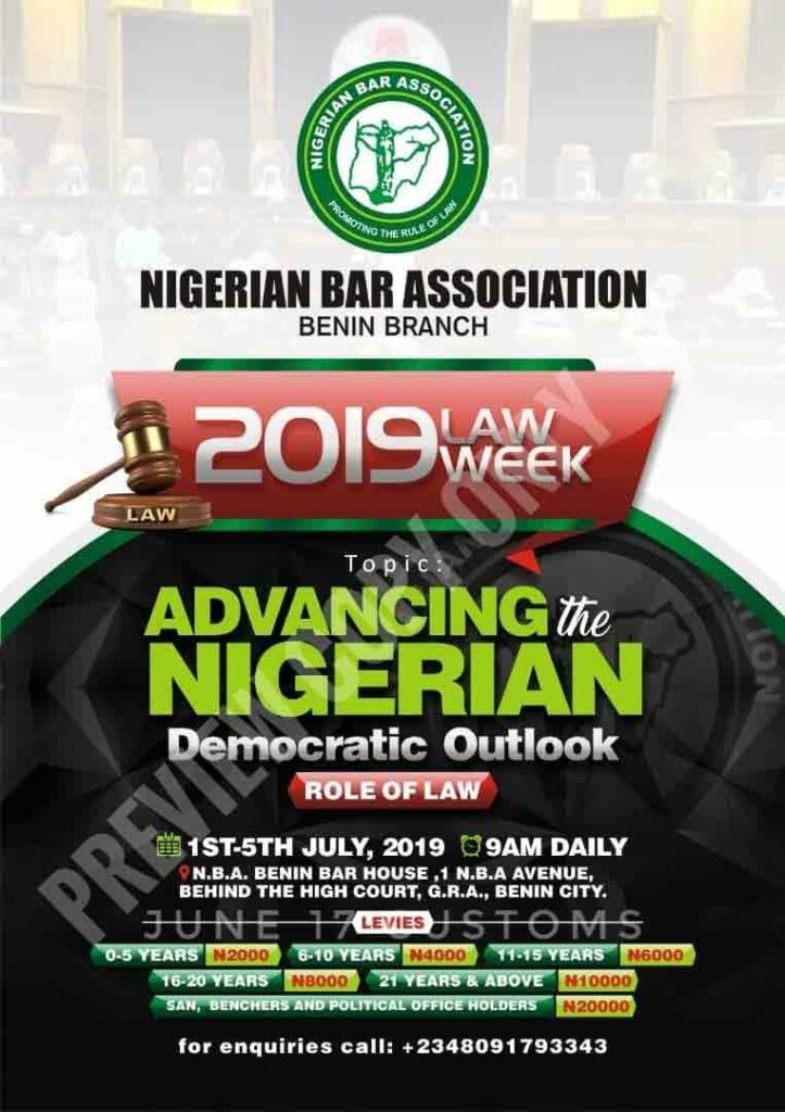 The law week will take place at NBA Benin House, 1 N.B.A Avenue, Behind High Court, G.R.A, Benin City, on the 1st-5th July 2019 by 9 am.