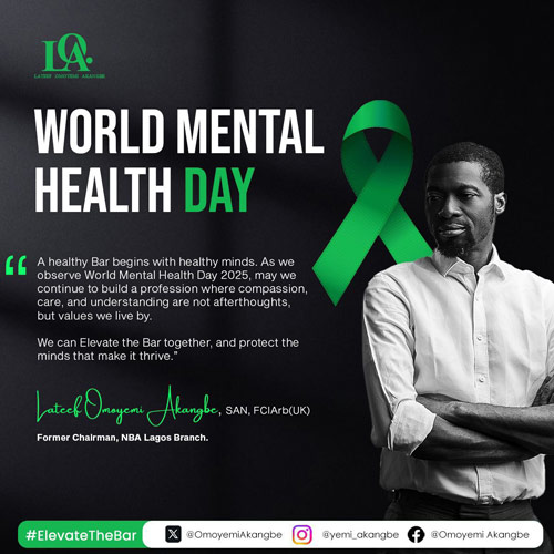 Speaking on World Mental Health Day, Akangbe highlighted the immense pressures faced by legal practitioners, noting that behind the robes and courtroom arguments are human beings who deserve care, understanding, and emotional support.