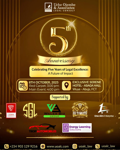 Uche Ojembe & Associates Legal Consult (UOALC) is set to celebrate its fifth anniversary on October 8, 2025, under the theme “Celebrating Five Years of Legal Excellence: A Future of Impact.”