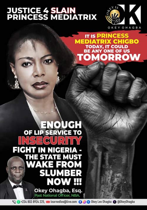 A past National Officer of the Nigerian Bar Association (NBA), Okey Leo Ohagba, has called on the Federal Government to end what he described as “lip service” to the fight against insecurity in Nigeria following the gruesome murder of Princess Mediatrix Chigbo, an Abuja-based lawyer, by suspected “One Chance” operators in the Federal Capital Territory.