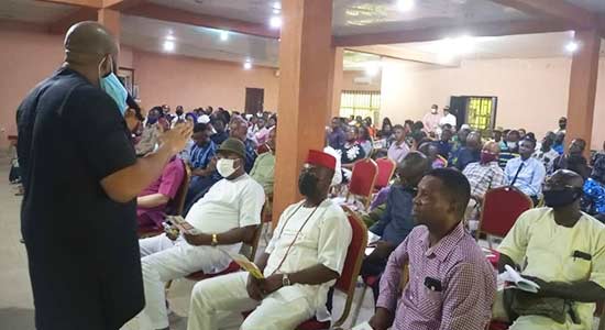 Director General, Edo State Health Insurance Commission (left), addressing members of Edo State branch of the Nigerian Bar Association (NBA) during a sensitisation visit in Benin City.