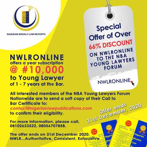 The Management of Nigerian Law Publications Limited, publishers of the Nigerian Weekly Law Reports (NWLR), has offered a 66% special discount to all young lawyers of 1 to 7 years who may wish to subscribe for NWLR online