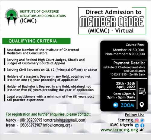 The Institute of Chartered Mediators and Conciliators is the professional body of dispute resolution practitioners with the mandate to regulate the practice of Mediation, train prospective candidates and encourage organizations and institutions to adopt Mediation and Conciliation as the primary means for resolving disputes.