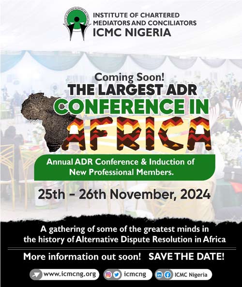 The Institute of Chartered Mediators and Conciliators (ICMC) Nigeria has announced that it will be hosting the largest Alternative Dispute Resolution (ADR) conference in Africa on the 25th and 26th of November, 2024.