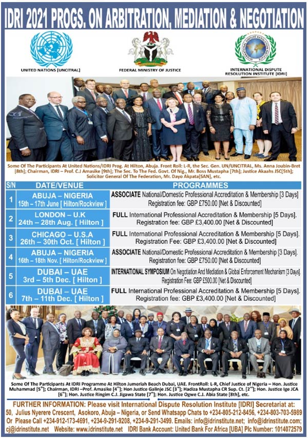 The ivy-league and prestigious institute’s [IDRI] programmes cover the entire fields of Arbitration, Mediation and Negotiation. These programmes are being organised and coordinated by the International Dispute Resolution Institute, in conjunction with the United Nations [UNCITRAL], Ministry of Justice [Nigeria], Emirates Law International [Dubai], international law firms in the U.S, UAE, U.K, Singapore & Hong Kong and other mega international ADR firms, etc.