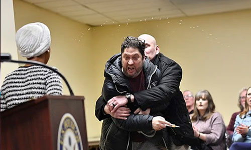 The protester – later identified as 55-year-old Anthony J. Kazmierczak – ran toward Omar and sprayed a mystery substance at her from a syringe.