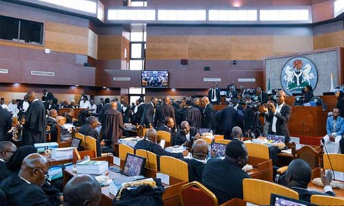 A crowd of lawyers, politicians, and others gather at the Supreme Court in Abuja