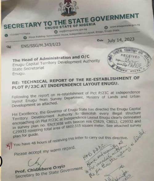 Though Ayogu had filed a civil suit asking the court to determine title to the disputed land, Enugu State Governor, Mr. Peter Mbah had directed the Enugu Capital Territory Development Authority (ECTDA) “to demolish every illegal structure encroaching on Plot P/23C at Independence Layout Enugu clearly delineated in in survey plan no. EN(E)658 with beacon nos. C5829, C8012, C29932 and C29933 covering total area of 6602.515 square meter (sic).”