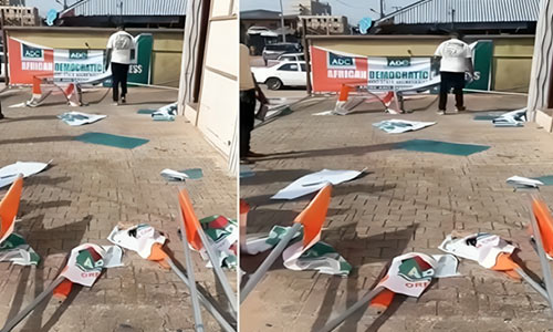 During the attack, some billboards around the building and other ADC emblems were pulled down, party flags within the premises were vandalised, and two windows were shattered, while part of the building was gutted by fire allegedly set by the suspected thugs.