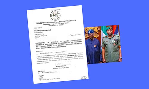 The letter, which surfaced on different media platforms, was signed by the National Security Adviser (NSA), Nuhu Ribadu, in which he conveyed the president’s approval for Col. Yusuf’s elevation.