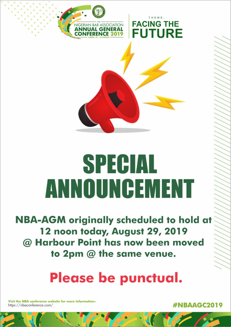 THE Nigerian Bar Association has postponed the ANNUAL GENERAL MEETING (AGM) to 2pm. The meeting was originally slated to today by 10am today.