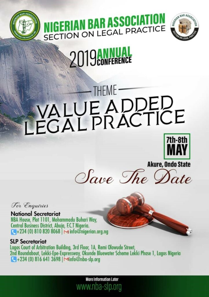 The Nigerian Bar Association Section on Legal Practice is set to hold its 2019 Annual Conference, with the theme, ”Value Added Legal Practice”