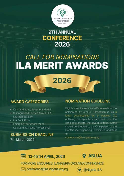 The International Law Association (ILA) Nigeria Branch has opened entries for its 2026 Merit Awards, calling on members of the legal profession to nominate outstanding professionals who have demonstrated excellence, leadership, and impact in the study and practice of international law in Nigeria and beyond.