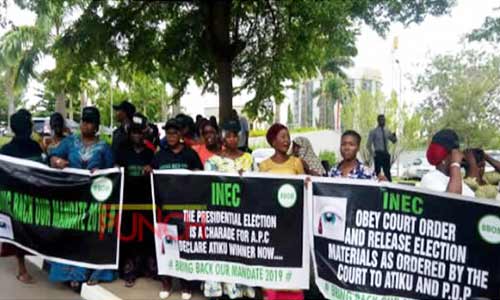 Some women in Abuja on Wednesday protested the alleged failure of the Independent National Electoral Commission to obey the order of the Court of Appeal in Abuja permitting the Peoples Democratic Party and its presidential candidate, Atiku Abubakar, to inspect the materials used for the February 23 poll.
