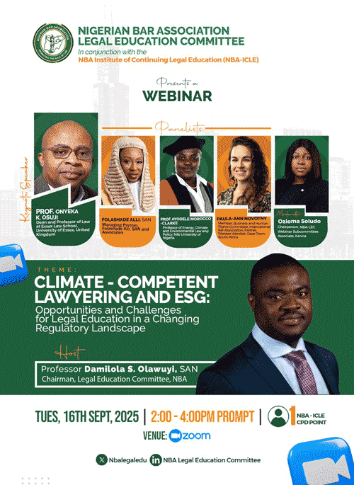 The Nigerian Bar Association (NBA) Legal Education Committee, in collaboration with the NBA Institute of Continuing Legal Education (NBA-ICLE), has announced a webinar themed: “Climate-Competent Lawyering and ESG: Opportunities and Challenges for Legal Education in a Changing Regulatory Landscape.”