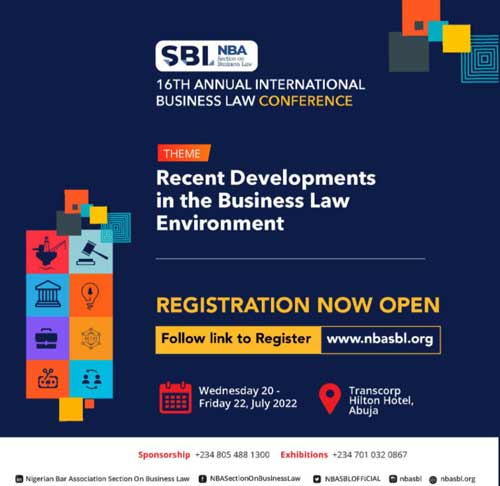 Registration has commenced for the 16th Annual International Business Law Conference of the Nigerian Bar Association Section on Business Law (NBA-SBL) at www.nbasbl.org.
