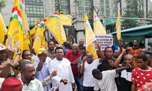 Protesters carried placards with inscriptions such as “Registrar-General Must Go,” “Respect Court Orders,” and “Deregistration of NYCN is a Security Concern,” blocking access roads to the CAC headquarters and chanting solidarity songs.