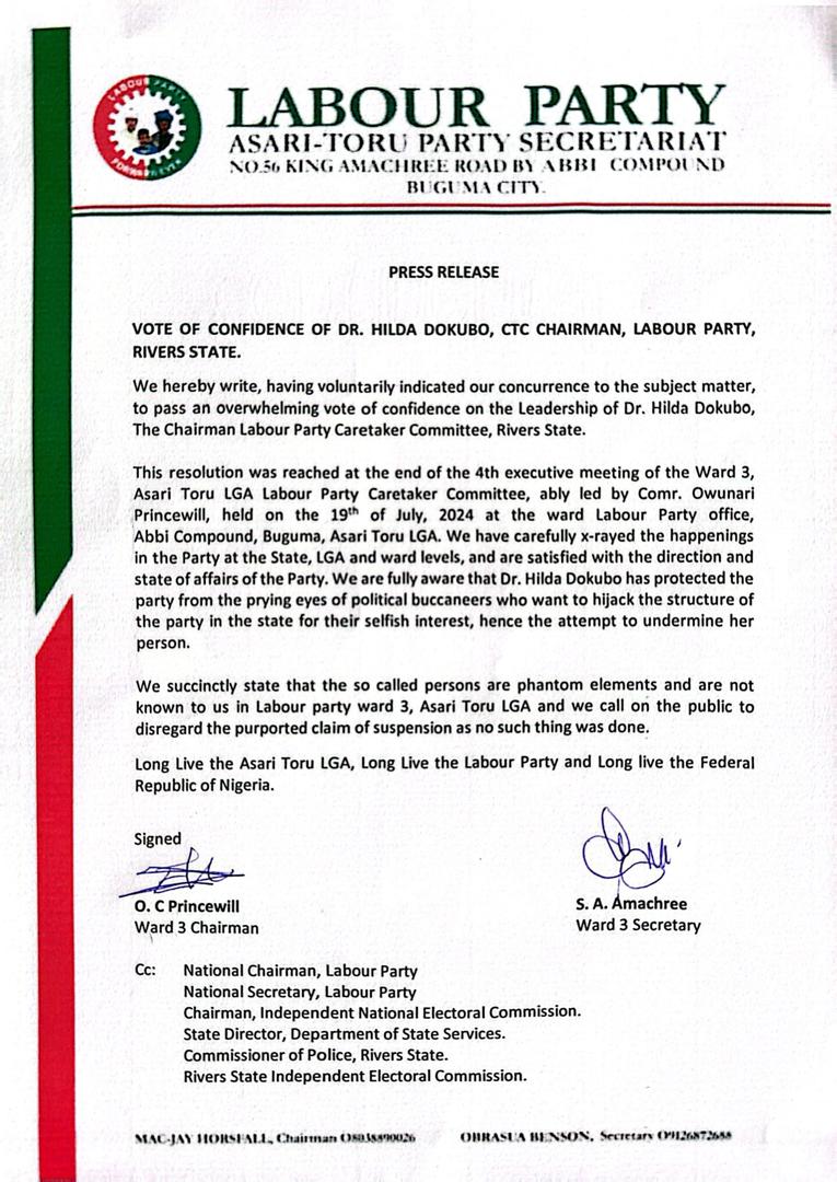 On July 19, 2024, the party’s Ward 3 executive committee in Asari-Toru LGA held its 4th meeting, resulting in a press release that emphatically supports Dr. Dokubo. The committee, led by Comrade Owunari Princewill, passed “an overwhelming vote of confidence” in Dr. Dokubo’s leadership as the Chairman of the Labour Party Caretaker Committee in Rivers State.