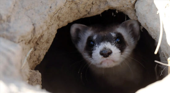 Black-footed ferrets are a type of weasel easily recognized by dark eye markings resembling a robber’s mask. Charismatic and nocturnal, they feed exclusively on prairie dogs while living in the midst of the rodents’ sometimes vast burrow colonies.