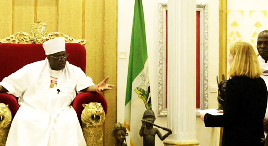 To underscore the significance of the historic visit to the Palace, the Ambassador in the accompany of her husband and a member of the Diplomatic Mission, presented a souvenir to Oba Ewuare II, who in turn gave a copy of the Federal Government Gazette on all Benin Artefacts to the envoy in appreciation.