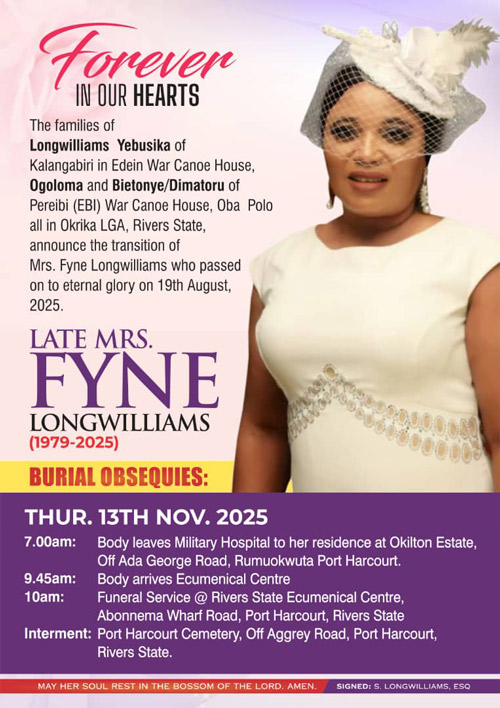 The announcement was signed by her husband, S. Longwilliams Esq., on behalf of the bereaved families. Tributes and condolences may be directed through the family representatives in Okrika LGA.
