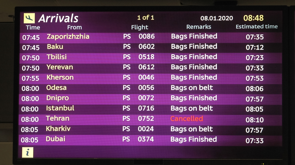 A screen with information and the cancelled flight from Tehran marked are seen at the Boryspil International Airport near Kyiv in Ukraine on Wednesday [Vladimir Shtanko/Anadolu]